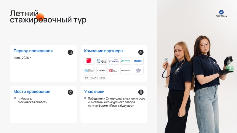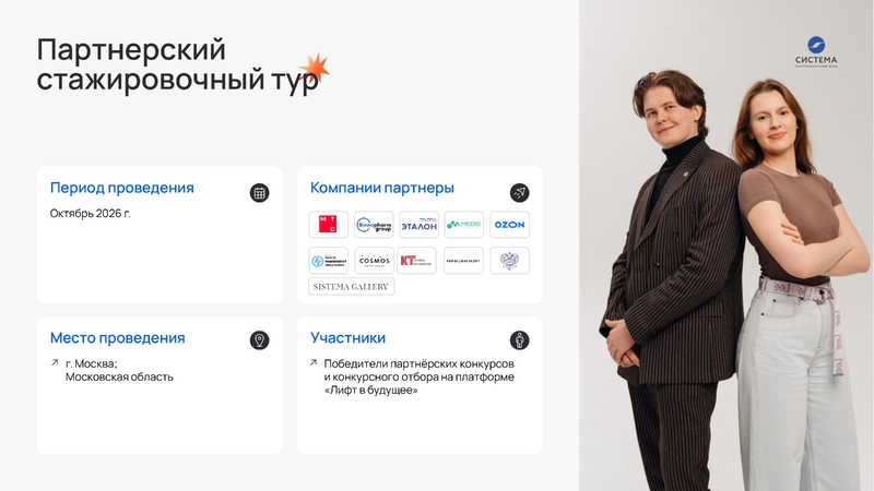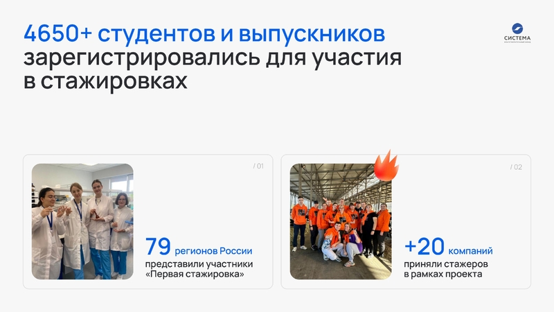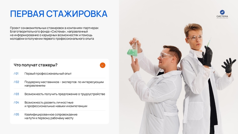 «Первая стажировка» – проект стажировок в компаниях-партнерах Благотворительного фонда «Система», направленный на информирование о карьерных возможностях и помощь молодежи в получении первого профессионального опыта.