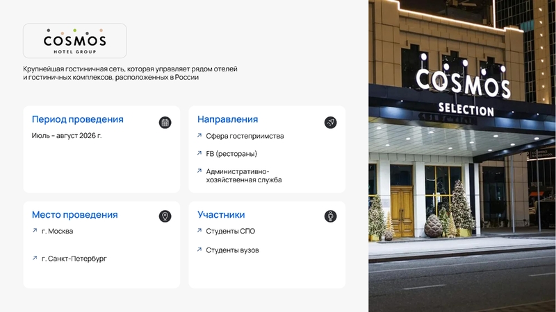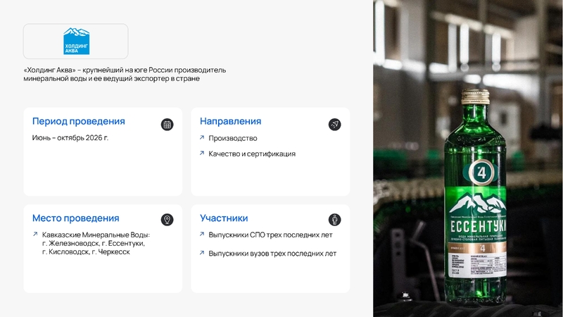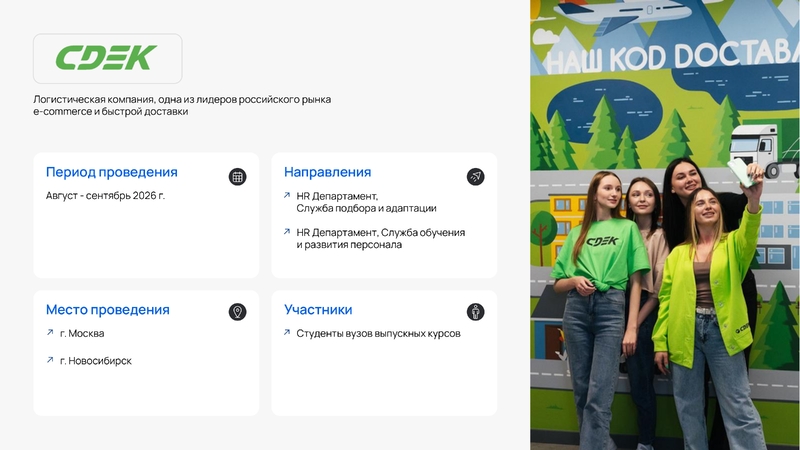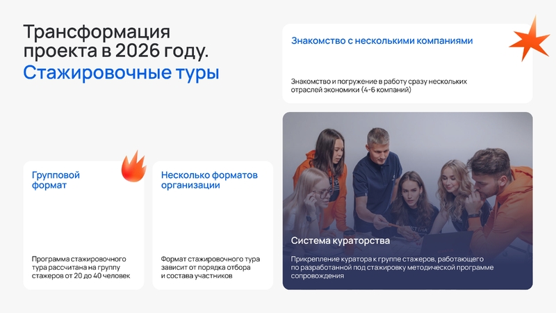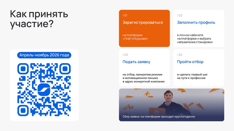 Стажеры, отобранные в рамках проекта, получают возможность познакомиться с ведущими работодателями, развить личностные и профессиональные навыки и компетенции, получить поддержку наставников – экспертов в интересующем направлении, а также предложение о трудоустройстве.